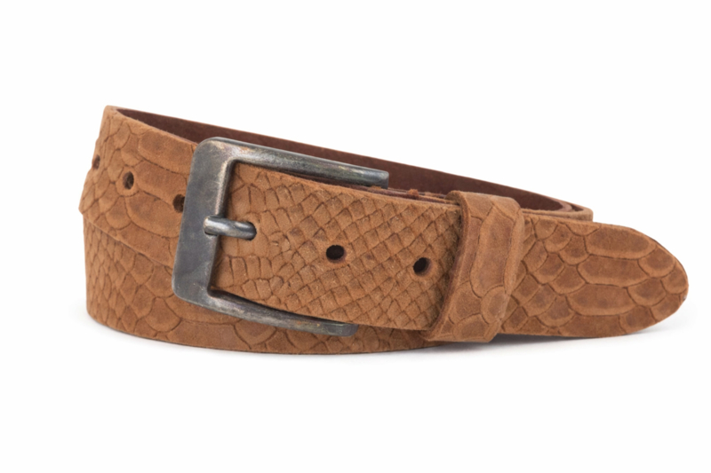 Geef je outfit een stijlvolle upgrade met deze leren herenriem in de kleur cognac. Deze leren herenriem met een slangenmotief, straalt een subtiele combinatie van klasse en karakter uit. Deze herenriemen zijn met zorg gemaakt in Nederland, waardoor je verzekerd bent van vakmanschap en duurzaamheid. Perfect te dragen met jeans, chino's of een nette broek. Voeg dit veelzijdige accessoire toe aan je garderobe en geniet van tijdloze stijl. De print van deze riemen zijn nooit precies het zelfde dit omdat het een natuurproduct betreft.